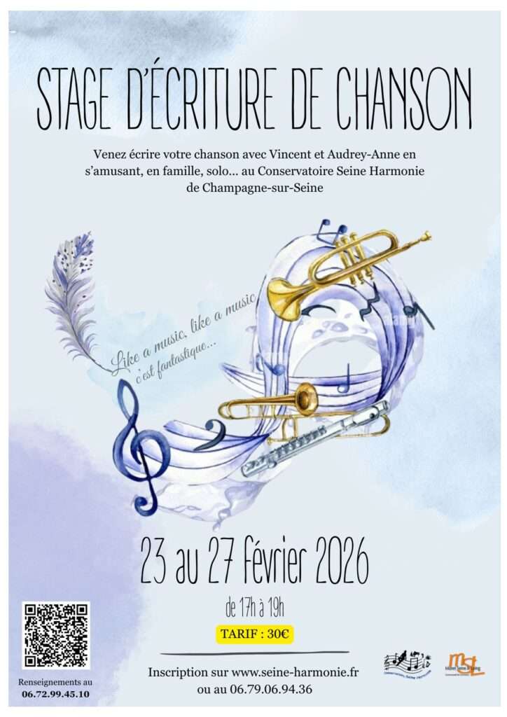Durant les prochaines vacances d'hiver un stage est proposé à toutes les personnes, enfants, ados, adultes de tout âge musiciens ou non, souhaitant mettre des mots sur des notes tout en s'amusant. Vincent et Audrey-Anne seront au Conservatoire de Champagne du 23 au 27 février de 17h à 19h pour vous initier à l'écriture musicale. Tarif : 30€ Lieu :...